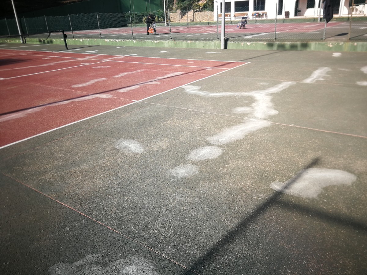 3 pistas de tenis unidas por el lateral de una comunidad de vecinos, ubicada en primera linea de mar, con los años ha perdido color y drenaje